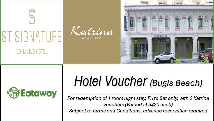 Hotel room bundle voucher: 1x 1 room night in ST Signature Bugis Beach (Fridays to Saturdays) and 2x Katrina S$20 value Katrina Voucher, stays in December 2025 to January 2026